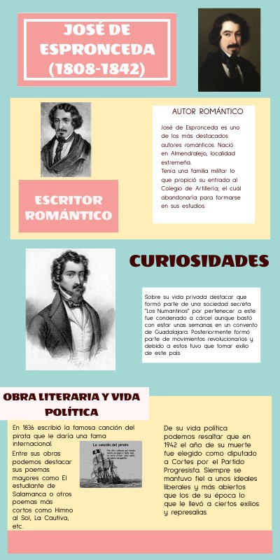 José de Espronceda es uno de los más destacados autores románticos. Nació en Almendralejo, localidad extremeña.Tenía una familia militar lo que propició su entrada al Colegio de Artillería; el cuál abandonaría para formarse en sus estudios.