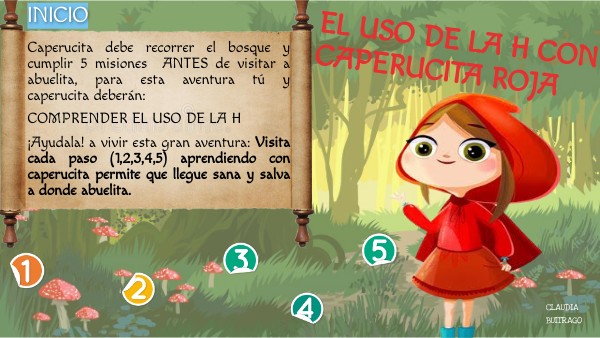 Caperucita debe recorrer el bosque y cumplir 5 misiones ANTES de visitar a abuelita, para esta aventura tú y caperucita deberán: COMPRENDER EL USO DE LA H ¡Ayudala! a vivir esta gran aventura: Visita cada paso (1,2,3,4,5) aprendiendo con caperucita permite que llegue sana y salva a donde abuelita.