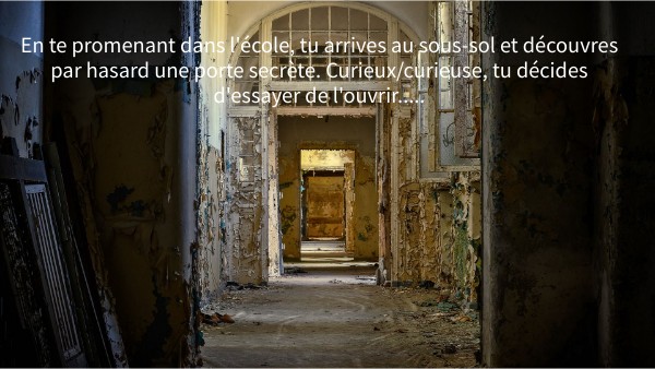 En te promenant dans l'école, tu arrives au sous-sol et découvres par hasard une porte secrète. Curieux/curieuse, tu décides d'essayer de l'ouvrir.....