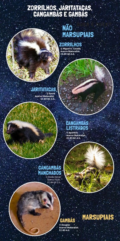 Comparação entre os animais parecidos Zorrilhos, Cangambás, Jaritatacas e Gambãs;