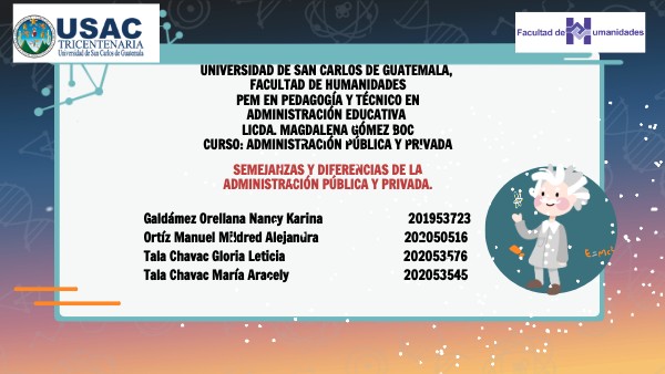 Universidad de San Carlos de Guatemala, Facultad de HumanidadesPEM en Pedagogía y Técnico en Administración Educativa Licda. magdalena gómez boc Curso: administración pública y privada