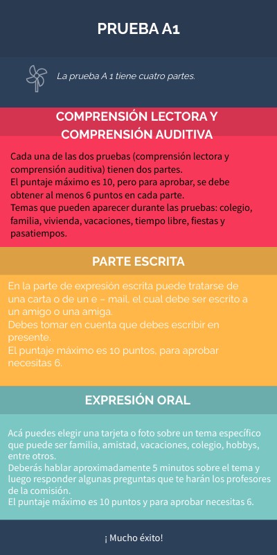 Cada una de las dos pruebas (comprensión lectora y comprensión auditiva) tienen dos partes. El puntaje máximo es 10, pero para aprobar, se debe obtener al menos 6 puntos en cada parte. Temas que pueden aparecer durante las pruebas: colegio, familia, vivienda, vacaciones, tiempo libre, fiestas y pasatiempos.