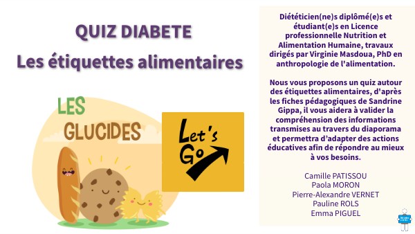 Diététicien(ne)s diplômé(e)s et étudiant(e)s en Licence professionnelle Nutrition et Alimentation Humaine, travaux dirigés par Virginie Masdoua, PhD en anthropologie de l'alimentation. Nous vous proposons un quiz autour des étiquettes alimentaires, d'après les fiches pédagogiques de Sandrine Gippa, il vous aidera à valider la compréhension des informations transmises au travers du diaporama et permettra d’adapter des actions éducatives afin de répondre au mieux à vos besoins. Camille PATISSOU Paola MORON Pierre-Alexandre VERNET Pauline ROLS Emma PIGUEL