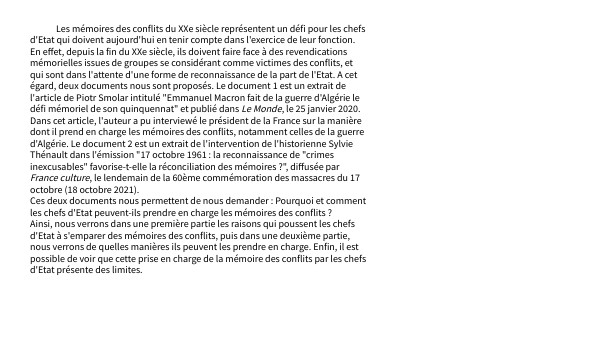 Les mémoires des conflits du XXe siècle représentent un défi pour les chefs d'Etat qui doivent aujourd'hui en tenir compte dans l'exercice de leur fonction. En effet, depuis la fin du XXe siècle, ils doivent faire face à des revendications mémorielles issues de groupes se considérant comme victimes des conflits, et qui sont dans l'attente d'une forme de reconnaissance de la part de l'Etat. A cet égard, deux documents nous sont proposés. Le document 1 est un extrait de l'article de Piotr Smolar intitulé "Emmanuel Macron fait de la guerre d'Algérie le défi mémoriel de son quinquennat" et publié dans Le Monde, le 25 janvier 2020. Dans cet article, l'auteur a pu interviewé le président de la France sur la manière dont il prend en charge les mémoires des conflits, notamment celles de la guerre d'Algérie. Le document 2 est un extrait de l'intervention de l'historienne Sylvie Thénault dans l'émission "17 octobre 1961 : la reconnaissance de "crimes inexcusables" favorise-t-elle la réconciliation des mémoires ?", diffusée par France culture, le lendemain de la 60ème commémoration des massacres du 17 octobre (18 octobre 2021). Ces deux documents nous permettent de nous demander : Pourquoi et comment les chefs d'Etat peuvent-ils prendre en charge les mémoires des conflits ? Ainsi, nous verrons dans une première partie les raisons qui poussent les chefs d'Etat à s'emparer des mémoires des conflits, puis dans une deuxième partie, nous verrons de quelles manières ils peuvent les prendre en charge. Enfin, il est possible de voir que cette prise en charge de la mémoire des conflits par les chefs d'Etat présente des limites.