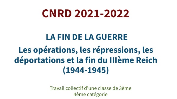 SITOGRAPHIE Ces sites internet ont été consultés par les élèves et ont servi de support à la réalisation de nombreux articles. Ils sont d'ailleurs mentionnés à la fin de chaque article. - De nombreuses vidéos du site Lumni en lien avec le CNRD : https://enseignants.lumni.fr/parcours/CnRD-fin-de-la-guerre - Sur les juifs de Hongrie : https://www.yadvashem.org/fr/shoah/a-propos/sort-des-juifs/massacre-des-juifs-de-hongrie.html#narrative_info et https://encyclopedia.ushmm.org/content/fr/article/hungary-after-the-german-occupation - Sur les fosses Ardéatines : https://www.liberation.fr/planete/1996/08/03/le-massacre-des-fosses-ardeatines_180472/ - Sur l'insurrection de Varsovie : https://www.youtube.com/watch?v=5e26Z1JXc0M et https://www.herodote.net/1er_aout_1944-evenement-19440801.php - L'opération Walkyrie : https://www.herodote.net/20_juillet_1944-evenement-19440720.php et https://www.histoire-pour-tous.fr/dossiers/3010-operation-walkyrie-lattentat-contre-hitler-20-juillet-1944.html - Le débarquement de Provence : https://www.youtube.com/watch?v=uoGVfmuwEIM et https://www.herodote.net/15_aout_1944-evenement-19440815.php - L'opération Bagratian : https://www.herodote.net/22_juin_1944-evenement-19440622.php - La bataille de Berlin : https://www.francetvinfo.fr/culture/patrimoine/histoire/retour-sur-la-bataille-de-berlin-la-plus-sanglante-de-la-seconde-guerre-mondiale_893147.html - Sur les juifs de France : https://www.memorialdelashoah.org/ et https://www.yadvashem.org/fr.html. - Deux sites consultés dans le cadre du travail sur les déportations en Ardèche. Pour l'exemple de Claire Blachon : https://fusilles-40-44.maitron.fr/spip.php?article178356