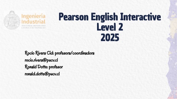 rocio.rivera@pucv.cl (Class teacher and program coordinator) ronald.dotte@pucv.cl Important contact rules: 1. Emails from 08:15 to 18:00 2. Whatsapp will not be an official means of communication for this class. No exceptions for this (teacher's mental health is important, too). *En caso de existir alguna situación problemática, primero se debe tratar con el profesor, luego con la coordinadora y luego en Docencia. *Los problemas de asistencia y de inasistencia a pruebas se deberán tratar con coordinadora y luego con jefe de docencia. *Todo lo relacionado con la plataforma se ve con el profesor o con la coordinadora, quien se contacta directamente con Pearson en caso de haber algún problema.