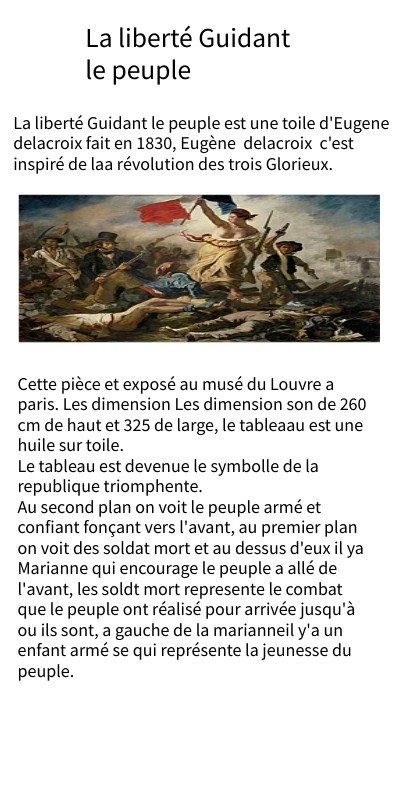 Cette pièce et exposé au musé du Louvre a paris. Les dimension Les dimension son de 260 cm de haut et 325 de large, le tableaau est une huile sur toile. Le tableau est devenue le symbolle de la republique triomphente. Au second plan on voit le peuple armé et confiant fonçant vers l'avant, au premier plan on voit des soldat mort et au dessus d'eux il ya Marianne qui encourage le peuple a allé de l'avant, les soldt mort represente le combat que le peuple ont réalisé pour arrivée jusqu'à ou ils sont, a gauche de la marianneil y'a un enfant armé se qui représente la jeunesse du peuple.