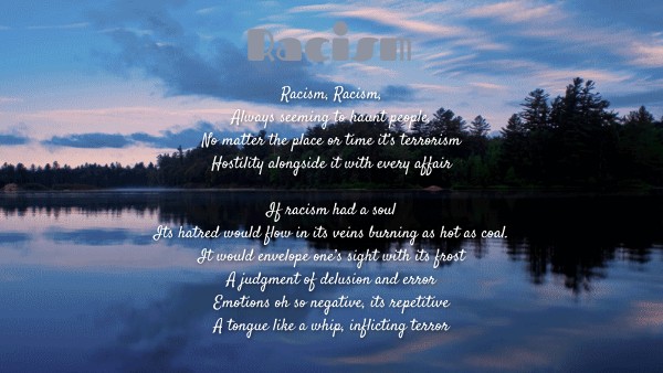Racism, Racism, Always seeming to haunt people, No matter the place or time it’s terrorism Hostility alongside it with every affair If racism had a soul Its hatred would flow in its veins burning as hot as coal. It would envelope one’s sight with its frost A judgment of delusion and error Emotions oh so negative, its repetitive A tongue like a whip, inflicting terror