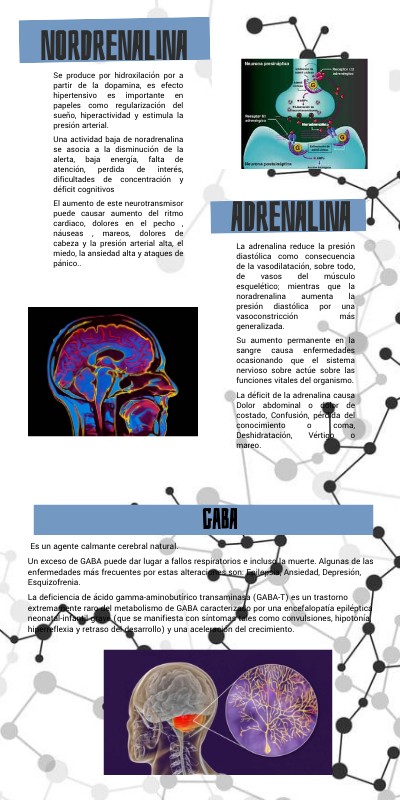 Se produce por hidroxilación por a partir de la dopamina, es efecto hipertensivo es importante en papeles como regularización del sueño, hiperactividad y estimula la presión arterial. Una actividad baja de noradrenalina se asocia a la disminución de la alerta, baja energía, falta de atención, perdida de interés, dificultades de concentración y déficit cognitivos El aumento de este neurotransmisor puede causar aumento del ritmo cardiaco, dolores en el pecho , náuseas , mareos, dolores de cabeza y la presión arterial alta, el miedo, la ansiedad alta y ataques de pánico..