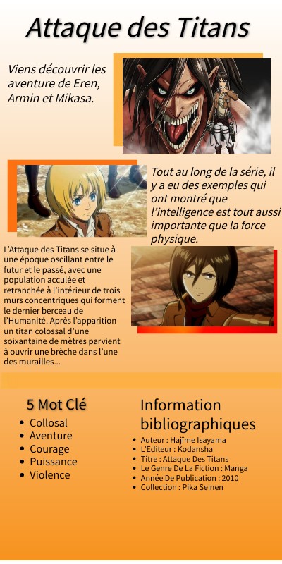 Viens découvrir les aventure de Eren, Armin et Mikasa.