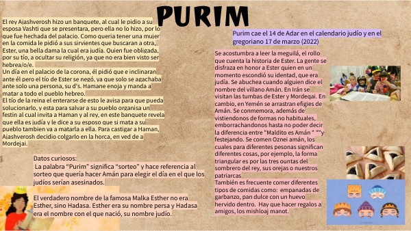 Datos curiosos: La palabra “Purim” significa “sorteo” y hace referencia al sorteo que quería hacer Amán para elegir el día en el que los judíos serían asesinados. El verdadero nombre de la famosa Malka Esther no era Esther, sino Hadasa. Esther era su nombre persa y Hadasa era el nombre con el que nació, su nombre judío.