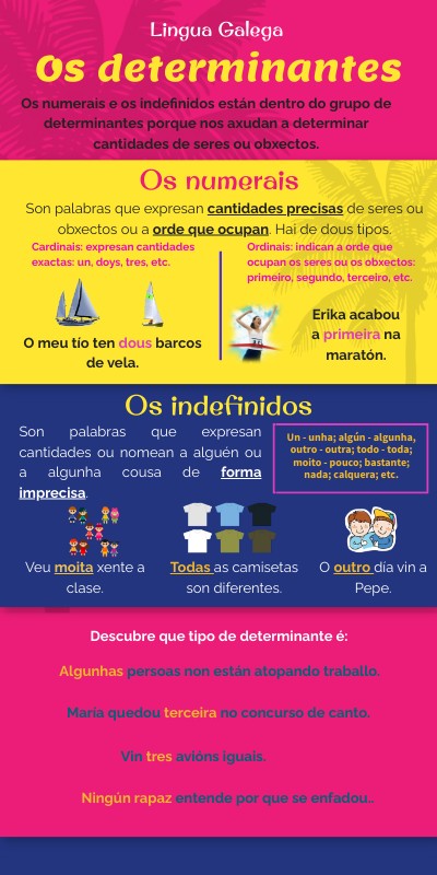 Os numerais e os indefinidos están dentro do grupo de determinantes porque nos axudan a determinar cantidades de seres ou obxectos.
