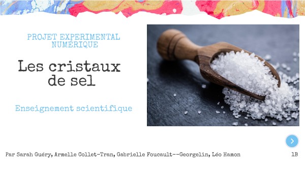 Durant ces 6 semaines de projet, nous avons choisi d'étudier un cristal, et nous avons opté pour le cristal de sel. Nos recherches sont centrées autour de la problématique suivante : - Quels peuvent être les facteurs qui influencent la formation et la structure macroscopique et microscopique des cristaux de sel ? Par ailleurs, nous avons utilisé pour capteur la caméra de notre téléphone, posée sur la loupe binoculaire, afin d'obtenir des photos de la structure microscopique du cristal. Nous nous sommes également appuyés d'une carte (mettant en évidence les marais salants en France) afin de comparer nos résultats avec les conditions propices aux marées salants.