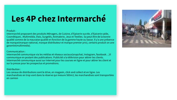 Produit :Intermarché proposent des produits Ménagers, de Cuisine, d’Epicerie sucrée, d’Epicerie salée, Cosmétiques , Multimédia ,frais, Surgelés, Animalerie, Jeux et Textiles. Sa peut être de la bonne qualité comme de la mauvaise qualité en fonction de la gamme haute ou basse. Il y’a une présence de marque(marque national, marque distributeur et marque premier prix), certains produit on une garantie(multimedia).Communication :Intermarché communique via les médias et réseaux sociaux(snapchat, Instagram, facebook…)il communique en postant des publications. Publicité a la télévision pour attirer les clients. Intermarché communique aussi sur Internet pour les courses en ligne et pour attirer les client et sur la presse pour les prospectus et promotions. Distribution :Les canaux de distributions sont le drive, en magasin, click and collect et en ligne. Les marchandises en trop vont dans la réserve qui mesure 500m2, les marchandises sont transportées en camion