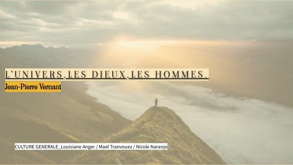 En 1999, les éditions du Seuil, publient dans la collection « la librairie de XXesiècle, un des derniers ouvrages de Jean-Pierre Vernant : L’univers, les dieux, les hommes. C’est un ouvrage qui prend place dans la dernière partie de la vie de l’auteur, et qui a connu un certain succès puisqu’il a été traduit dans 32 langues. Ce livre est une synthèse des mythes grecs, dans laquelle ont été mobilisés les savoirs du chercheur et la pédagogie de l’enseignement. Il évoque les origines de l’Univers, la guerre des dieux et les liens que l’humanité n’a cessé d’entretenir avec le divin. De la castration d’Ouranos aux ruses de Zeus, de l’invention de la femme au voyage d’Ulysse, des aventures d’Europe au destin boiteux d’Œdipe et à la course aux Gorgones, l’auteur nous fait entendre ces vieux mythes toujours vivants.Jean-Pierre Vernant, qui a consacré sa vie à la mythologie grecque, nous permet alors de mieux en déchiffrer le sens souvent multiple. C’est à cette rencontre entre le conteur et le savant que ce livre doit son originalité. Dans son Avant-popos, Vernant écrit : « Dans ce livre, j’ai tenté de livrer directement de bouche à oreille un peu de cet univers grec auquel je suis attaché et dont la survie en chacun de nous me semble, dans le monde d’aujourd’hui, plus que jamais nécessaire. Il me plaisait aussi que cet héritage parvienne au lecteur sur le mode de ce que Platon nomme des fables de nourrice, à la façon de ce qui se passe d’une génération à la suivante en dehors de tout enseignement officiel. J’ai essayé de raconter comme si la tradition de ces mythes pouvait se perpétuer encore. La voix qui autrefois, pendant des siècles, s’adressait directement aux auditeurs grecs, et qui s’est tue, je voulais qu’elle se fasse entendre de nouveau au lecteurs d’aujourd’hui, et que, dans certaines pages de ce livre, si j’y suis parvenu, ce soit elle, en écho, qui continue à résonner. »