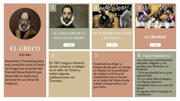 Doménikos Theotokópoulos más conocido como el Greco (el Griego) fue un pintor del final del Renacimiento que desarrolló un estilo muy personal en sus obras de madurez.