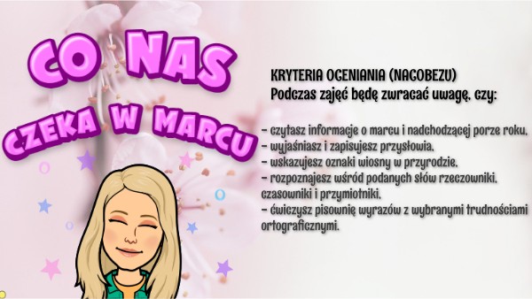 - czytasz informacje o marcu i nadchodzącej porze roku, - wyjaśniasz i zapisujesz przysłowia, - wskazujesz oznaki wiosny w przyrodzie, - rozpoznajesz wśród podanych słów rzeczowniki, czasowniki i przymiotniki, - ćwiczysz pisownię wyrazów z wybranymi trudnościami ortograficznymi.