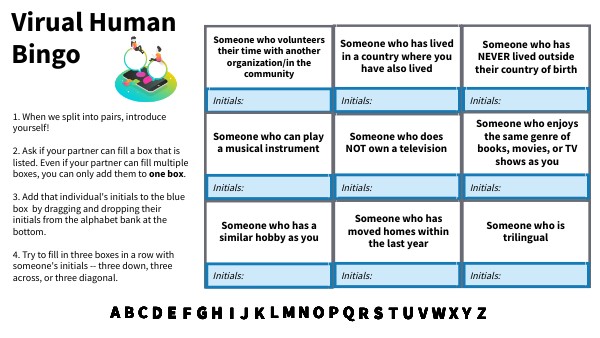 1. When we split into pairs, introduce yourself! 2. Ask if your partner can fill a box that is listed. Even if your partner can fill multiple boxes, you can only add them to one box. 3. Add that individual's initials to the blue box by dragging and dropping their initials from the alphabet bank at the bottom. 4. Try to fill in three boxes in a row with someone's initials -- three down, three across, or three diagonal.