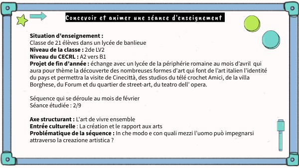Situation d'enseignement : Classe de 21 élèves dans un lycée de banlieue Niveau de la classe : 2de LV2 Niveau du CECRL : A2 vers B1 Projet de fin d'année : échange avec un lycée de la périphérie romaine au mois d’avril qui aura pour thème la découverte des nombreuses formes d'art qui font de l’art italien l’identité du pays et permettra la visite de Cinecittà, des studios du télé crochet Amici, de la villa Borghese, du Forum et du quartier de street-art, du teatro dell’ opera. Séquence qui se déroule au mois de février Séance étudiée : 2/9 Axe structurant : L'art de vivre ensemble Entrée culturelle : La création et le rapport aux arts Problématique de la séquence : In che modo e con quali mezzi l’uomo può impegnarsi attraverso la creazione artistica ?