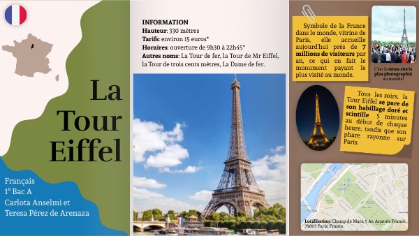 INFORMATION Hauteur: 330 mètres Tarifs: environ 15 euros* Horaires: ouverture de 9h30 à 22h45* Autres noms: La Tour de fer, la Tour de Mr Eiffel, la Tour de trois cents mètres, La Dame de fer.