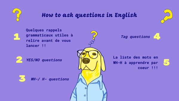 Règle pour former ce type de question : AUXILIARY VERB + SUBJECT + MAIN VERB + OBJECT (or other information) + ? ATTENTION: si le main verb de la phrase est BE, on le place directement en auxiliaire et on n'a pas de main verb.