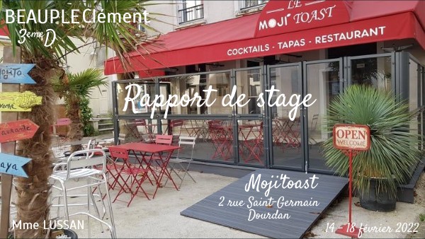 Ce stage, effectué au Moji’toast m’a plu, car en plus d’observer et de questionner le personnel, j’ai eu la chance de pouvoir travailler à plusieurs postes, et de ressentir au mieux le travail des restaurateurs. Le travail dans un restaurant est très varié, et chaque employé possède sa spécificité : la cuisinière, le serveur, le barman… La cadence est très dure avec : la préparation en cuisine (le nettoyage et la découpe des légumes et des frites, la préparation des sauces, la découpe des viandes...), le service (dresser les tables, prendre les commande, servir les plats faire la vaisselle...), l’après-service ( nettoyage et rangement de la salle).