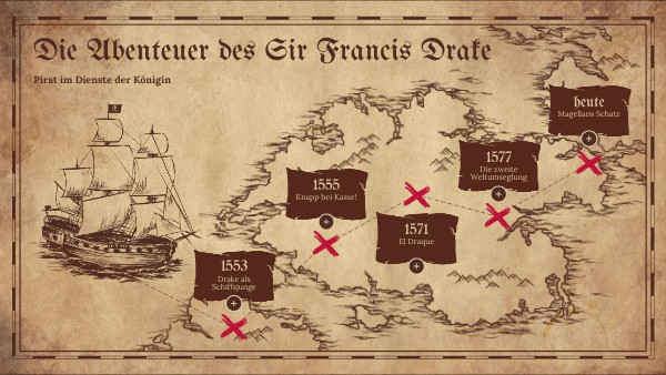 Francis Drake kaperte sich seinen Weg um die Welt und plünderte, was das Zeug hielt. Als Drake die Heimreise antreten wollte, entschied er sich mangels wirklicher Alternativen für die Suche und landete schließlich an der amerikanischen Westküste, überquerte dann den Pazifik und gelangte über Java und das Kap der Guten Hoffnung nach 1.018 Tagen schließlich nach England. Dort wurde er von der Königin persönlich empfangen, die ihm zuflüsterte: „Francis Drake, Ihr seid ein Schurke, und um meiner Ehre willen muss ich mich von Euch lossagen.“