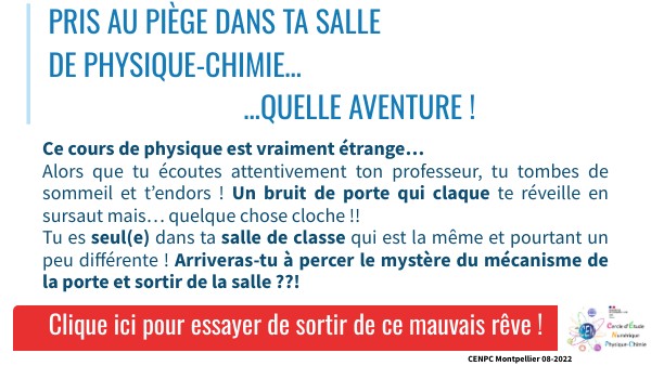 Ce cours de physique est vraiment étrange…Alors que tu écoutes attentivement ton professeur, tu tombes de sommeil et t’endors ! Un bruit de porte qui claque te réveille en sursaut mais… quelque chose cloche !! Tu es seul(e) dans ta salle de classe qui est la même et pourtant un peu différente ! Arriveras-tu à percer le mystère du mécanisme de la porte et sortir de la salle ??!