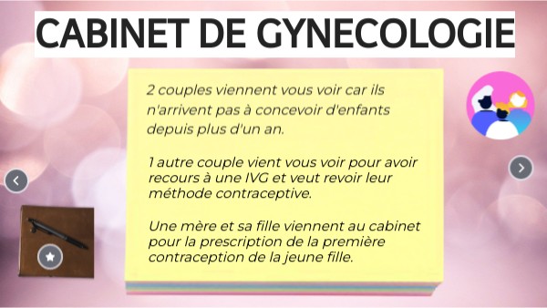A la fin de ces quatre rendez-vous, vous devrez rédiger un compte-rendu médical expliquant les causes de l'infertilité ainsi que la ou les solutions que vous proposez pour les 2 couples. Pour le 3ème couple, faites un rapide historique de l'IVG puis expliquez au couple comment se passera l'IVG et finissez par leur recommander la contraception adaptée à leur situation en justifiant. Pour le dernier couple, présentez le principe de la pilule et proposez la méthode de contraception la plus adaptée en argumentant.