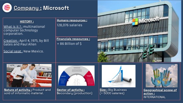 What is it ? : multinational computer technology corporation. Creation : April 4, 1975, by Bill Gates and Paul Allen Social seat : New Mexico.