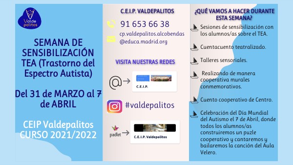 SEMANA DE SENSIBILIZACIÓN TEA (Trastorno del Espectro Autista) Del 31 de MARZO al 7 de ABRIL CEIP Valdepalitos CURSO 2021/2022