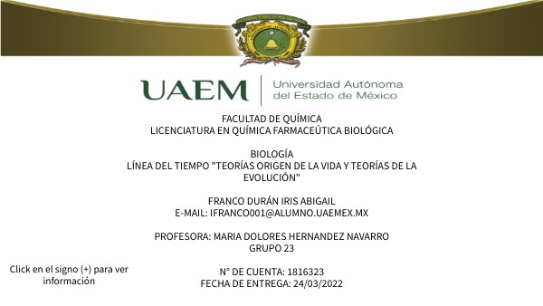 FACULTAD DE QUÍMICA LICENCIATURA EN QUÍMICA FARMACEÚTICA BIOLÓGICA BIOLOGÍA LÍNEA DEL TIEMPO "TEORÍAS ORIGEN DE LA VIDA Y TEORÍAS DE LA EVOLUCIÓN" FRANCO DURÁN IRIS ABIGAIL E-MAIL: IFRANCO001@ALUMNO.UAEMEX.MX PROFESORA: MARIA DOLORES HERNANDEZ NAVARRO GRUPO 23 N° DE CUENTA: 1816323 FECHA DE ENTREGA: 24/03/2022