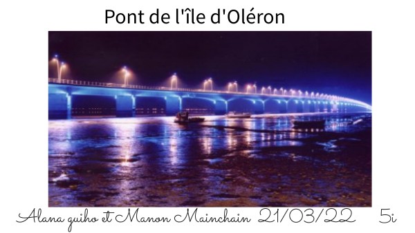 Relie le continent( la commune de Bourcefranc-Le-Chapus) à la presque île d'Oleron.Ouvrage d'art. Transporte de l'eau potable et de l’électricité.