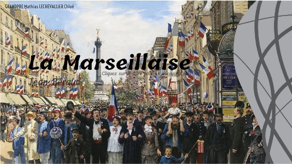 La Marseillaise est un chant de guerre écrit en 1792 par Rouget de Lisle pour l’armée du Rhin. Elle fut instaurée comme hymne de 1795 sous la première jusqu’à l’instauration de l’Empire en 1804. Le chant fut abandonné jusqu’à ce que la troisième République le réinstalle comme hymne en 1879. Sur le tableau la représentation du chant est purement métaphorique. On ne peut distinguer que le peuple chantant à l’unisson. L’hymne est donc un moyen pour le peuple de s’unir à la République pour ne former qu’une nation.