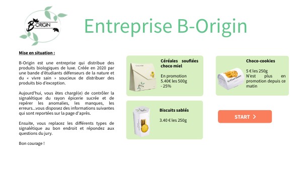 Mise en situation : B-Origin est une entreprise qui distribue des produits biologiques de luxe. Créée en 2020 par une bande d’étudiants défenseurs de la nature et du « vivre sain » soucieux de distribuer des produits bio d’exception. Aujourd'hui, vous ètes chargé(e) de contrôler la signalétique du rayon épicerie sucrée et de repérer les anomalies, les manques, les erreurs...vous disposez des informations suivantes qui sont reportées sur la page d'après. Ensuite, vous replacez les différents types de signalétique au bon endroit et répondez aux questions du jury. Bon courage !