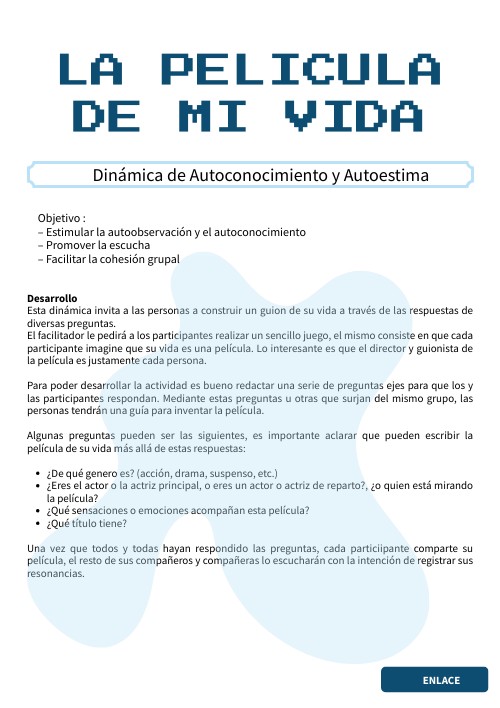 Desarrollo Esta dinámica invita a las personas a construir un guion de su vida a través de las respuestas de diversas preguntas. El facilitador le pedirá a los participantes realizar un sencillo juego, el mismo consiste en que cada participante imagine que su vida es una película. Lo interesante es que el director y guionista de la película es justamente cada persona. Para poder desarrollar la actividad es bueno redactar una serie de preguntas ejes para que los y las participantes respondan. Mediante estas preguntas u otras que surjan del mismo grupo, las personas tendrán una guía para inventar la película. Algunas preguntas pueden ser las siguientes, es importante aclarar que pueden escribir la película de su vida más allá de estas respuestas: