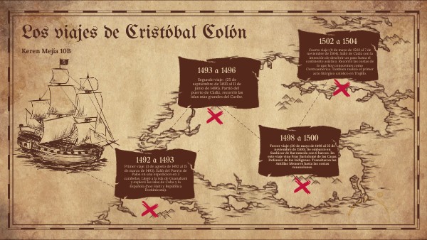 Primer viaje: (3 de agosto de 1492 al 15 de marzo de 1493). Salió del Puerto de Palos en una expedicion en 3 carabelas. Llegó a la isla de Guanahaní y exploró las islas de Cuba y la Española (hoy Haíti y República Dominicana).