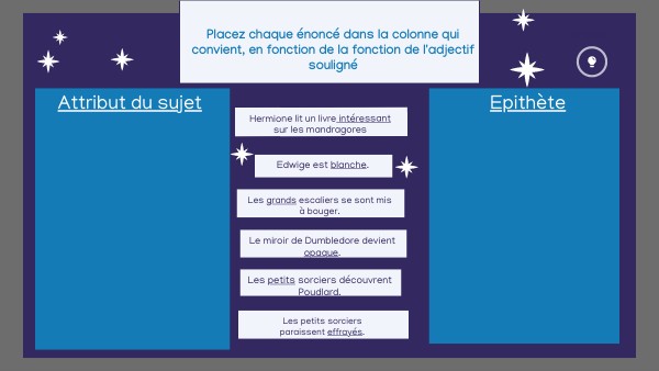 Placez chaque énoncé dans la colonne qui convient, en fonction de la fonction de l'adjectif souligné