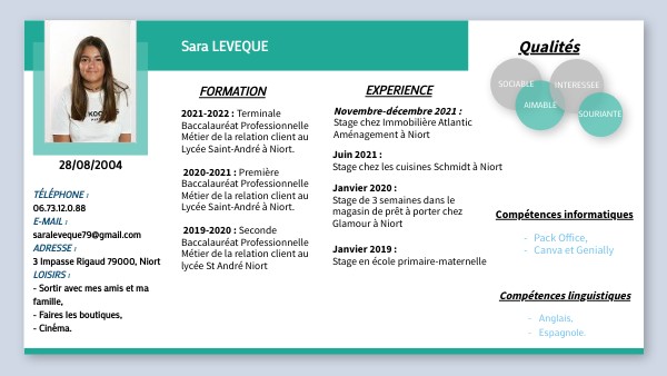 TÉLÉPHONE :06.73.12.0.88 E-MAIL : saraleveque79@gmail.com ADRESSE : 3 Impasse Rigaud 79000, Niort LOISIRS : - Sortir avec mes amis et ma famille, - Faires les boutiques, - Cinéma.