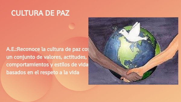 A.E.:Reconoce la cultura de paz como un conjunto de valores, actitudes, comportamientos y estilos de vida basados en el respeto a la vida