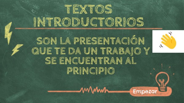 " Comúnmente tenemos tipos de textos introductorios como lo son: -Introducción -Justificación -Presentación -Prólogo o prefacio -Nota editorial -Advertencia -Resumen o Abstract -Dedicatoria -Reseña literaria