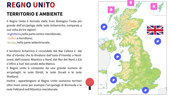 Il Regno Unito è formato dalla Gran Bretagna l'isola più grande dell'arcipelago delle isole britanniche; composta a sua volta da tre regioni: -Inghilterra,nella parte centro-meridionale; - Galles a meridione; -Scozia, nella parte settentrionale; Il territorio britannico è circondato dal Mar Celtico e dal Mar d'Irlanda( che lo dividono dall'isola d'Irlanda) a Nord-ovest, dall'oceano Atlantico a Nord, dal Mar del Nord a Est e infine a Sud dal canale della Manica. Il Regno unito è composto da una grande numero di arcipelaghi: le isole Ebridi, le isole Orcadi e le isole Shetland. Inoltre , appartengono al Regno Unito numerosi territori oltre mare come per esempio l'arcipelago di Bermuda e le isole Falkland nell'Atlantico meridionale