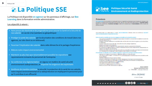 Les engagements pris dans la Politique Santé Sécurité Environnement sont retranscrits dans l’Engagement Santé Sécurité Environnement s'appliquant uniquement au périmètre MASE (Lyon et Aix-En-Provence) L’Engagement est disponible en agence sur les panneaux d’affichage, remis à chaque nouvel arrivant lors de l’accueil sécurité et disponible sur Bee Learning formation « entrée administrative ».