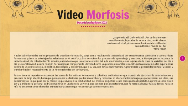Hablar sobre identidad en los procesos de creación y formación, surge como resultado de la necesidad por cuestionarnos como área y como artistas formadores ¿cómo se entretejen las relaciones en el aula? y ¿cómo se nutren los procesos de aprendizaje y creación, al tiempo que se reconoce la individualidad y la colectividad? lo anterior, entendiendo que las acciones dentro del aula son inciertas, están sujetas a toda clase de variables del día a día y se constituyen bajo una relación horizontal que comprende la identidad como un proceso en constante construcción en relación a las experiencias dentro de una cultura social, mediática, tecnológica y económica, que a su vez, nos lleva a reafirmar una ruptura hacia la generalidad cultural y social, y transitar hacia el reconocimiento de la heterogeneidad del ser humano. Para el área es importante reconocer las voces de los artistas formadores y colectivos audiovisuales que a partir de ejercicios de caracterización y procesos de largo aliento, hacen preguntas sobre las historias que les hacen vibrar y reconocer en el arte múltiples lenguajes para expresar sus ideas, sus pensamientos, lo que pasa por su mente, lo que viven en su cotidianidad, sus miedos, angustias y caos como punto de partida. La premisa sobre quien soy y si mi historia personal podría convertirse en una historia universal que conecte a los espectadores, nos ha retado a buscar hacia adentro, hacia la raíz, ha encontrar seres e historias extraordinarias en eso que nos construye como seres sociales.