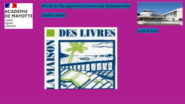 Carte identité de l’entreprise :Nom de l’entreprise:Maison Des Livres Adresse :24 rues Place Mariage 97600 Mamoudzou Forme juridique: SAS Capital: 38110.00£ Date de création: 2 janvier 1991 Effectif global: 40 à 50 salariés Siret: 09937742600012 Code naf :4761z