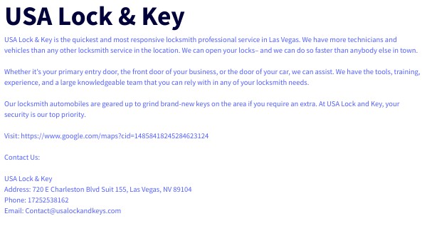 USA Lock & Key is the quickest and most responsive locksmith professional service in Las Vegas. We have more technicians and vehicles than any other locksmith service in the location. We can open your locks– and we can do so faster than anybody else in town. Whether it’s your primary entry door, the front door of your business, or the door of your car, we can assist. We have the tools, training, experience, and a large knowledgeable team that you can rely with in any of your locksmith needs. Our locksmith automobiles are geared up to grind brand-new keys on the area if you require an extra. At USA Lock and Key, your security is our top priority. Visit: https://www.google.com/maps?cid=14858418245284623124 Contact Us: USA Lock & Key Address: 720 E Charleston Blvd Suit 155, Las Vegas, NV 89104 Phone: 17252538162 Email: Contact@usalockandkeys.com