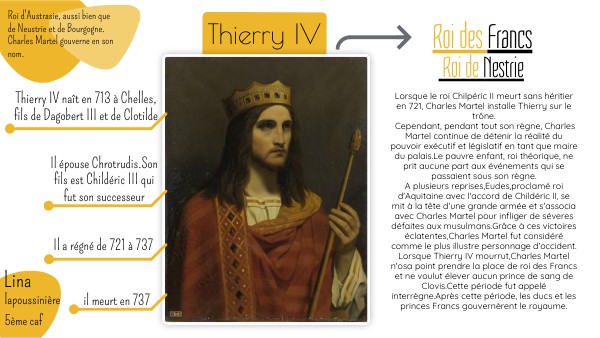 Lorsque le roi Chilpéric II meurt sans héritier en 721, Charles Martel installe Thierry sur le trône. Cependant, pendant tout son règne, Charles Martel continue de détenir la réalité du pouvoir exécutif et législatif en tant que maire du palais.Le pauvre enfant, roi théorique, ne prit aucune part aux événements qui se passaient sous son règne. A plusieurs reprises,Eudes,proclamé roi d'Aquitaine avec l'accord de Childéric II, se mit à la tête d'une grande armée et s'associa avec Charles Martel pour infliger de séveres défaites aux musulmans.Grâce à ces victoires éclatentes,Charles Martel fut considéré comme le plus illustre personnage d'occident. Lorsque Thierry IV mourrut,Charles Martel n'osa point prendre la place de roi des Francs et ne voulut élever aucun prince de sang de Clovis.Cette période fut appelé interrègne.Après cette période, les ducs et les princes Francs gouvernèrent le royaume.
