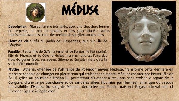 Famille : Petite fille de Gaïa (la terre) et de Pontos (le flot marin), fille de Phorcys et de Céto (divinités marines), elle est l'une des trois Gorgones (avec ses soeurs Sthéno et Euryale) mais c'est la seule à être mortelle.