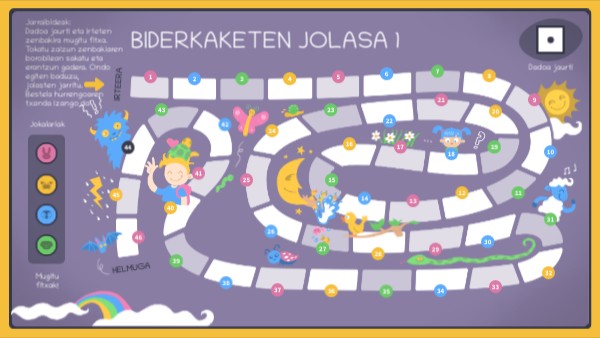 Jarraibideak: Dadoa jaurti eta irteten zenbakira mugitu fitxa. Tokatu zaizun zenbakiaren borobilean sakatu eta erantzun gadera. Ondo egiten baduzu,jolasten jarritu.Bestela hurrengoarentxanda izango da