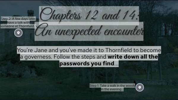You're Jane and you've made it to Thornfield to become a governess. Follow the steps and write down all the passwords you find...